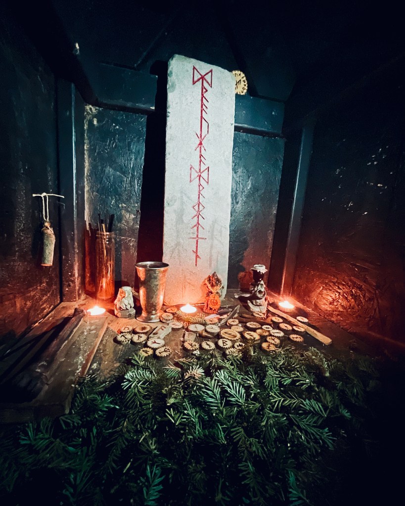 Strive to replace the rune set every year, if made of wood. If the runes are made of stone, they should be washed, cleansed and re-consecrated through galdr and one’s own blood. Last, libations should be made according to your means, but it is recommended to refresh the drinking vessel either every 3 days, 9 days, 45 days, and/or on full Moons. When throwing out the old libation, it should be offered to a tree or local spirit, never put into the drain or trash.